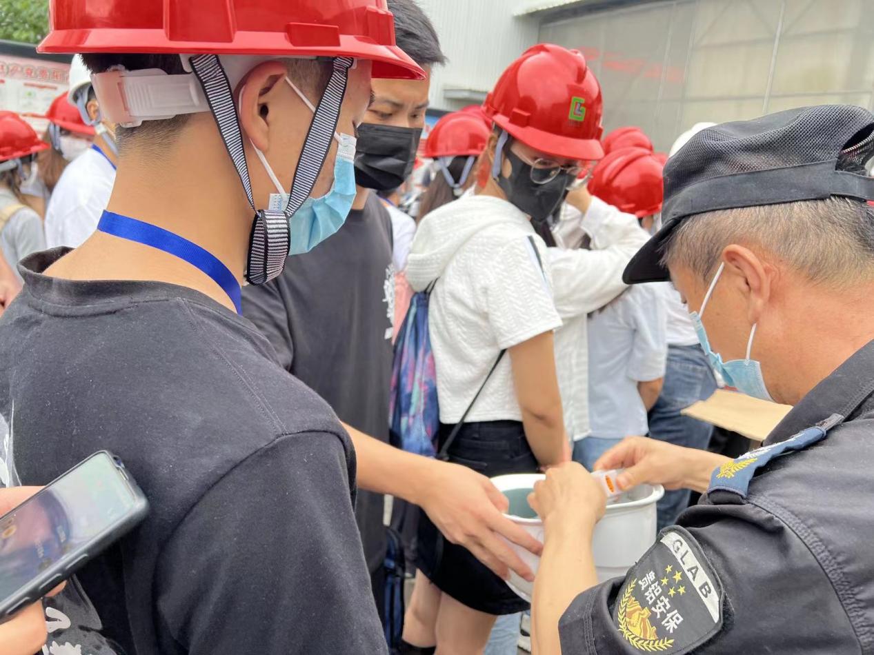 (工作人員悉心指導(dǎo)畢業(yè)生規(guī)范佩戴安全帽)
